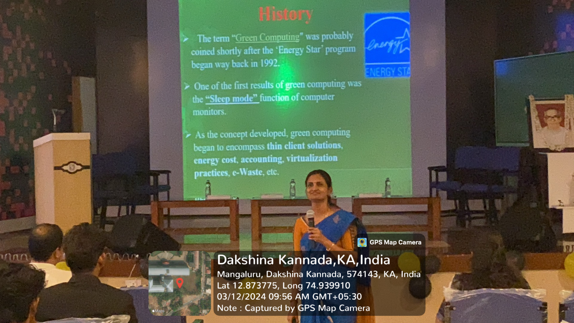 The Department of MCA successfully organized a talk on Green Computing featuring Dr. Jyothimani K as the guest speaker. The event, held in the presence of the Head of Department, Dr. Shashidhar Kini K, and faculty coordinator Rajesh Naik, covered various aspects of green computing. Introduction to Green Computing: Dr. Jyothimani K provided an insightful introduction to the concept of green computing, emphasizing its importance in the current technological landscape. The talk delved into the significance of incorporating eco-friendly practices in computing instructions. A historical perspective was presented to underscore the evolution of green computing principles. Dr. Jyothimani K discussed coding practices that contribute to environmental sustainability. Insights were shared regarding the impact of computing infrastructure on energy consumption. The guest speaker addressed challenges associated with green computing and proposed viable solutions to overcome them. Dr. Jyothimani K highlighted the positive outcomes and advantages of adopting green computing practices.This event served as a valuable platform for students and faculty members to gain knowledge about the principles, challenges, and future directions of green computing. The active participation of Dr. Shashidhar Kini K and faculty coordinator Rajesh Naik further enriched the academic atmosphere. The Department of MCA remains committed to promoting sustainable and responsible computing practices.