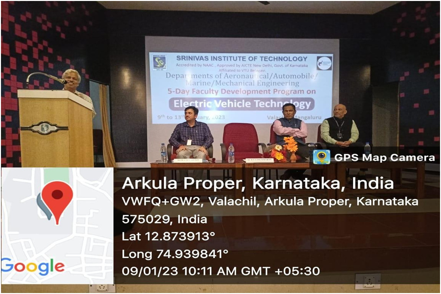 The program focused on the know how’s of the Electric vehicles catering not just the basics of the technology, but also the recent trends and research carried out in the field. We had a total of 42 participants ranging from colleges from across the country. The 5day program commenced on the 9 th of January 2023. The chief guest of the inaugural function, Dr. K V Gangadharan, Professor, Dept. Of Mechanical Engineering and faculty coordinator, Centre for system design at NITK, Surathkal gave the keynote address. He highlighted the importance of Electric Vehicles at large and also inspired the audience by showcasing the various range of electric vehicles which were developed at the Centre under his tutelage. Various aspects of electric vehicle technology were discussed and expert lectures were presented by experts from NITK and industries over the different sessions. Topics ranging from Numerical electromagnetic analysis, experimental data acquisition of sensors and actuators,Programming for data acquisition, Battery Management systems and battery modeling, Torsional vibration isolation in electric motors, Battery materials, Power Electronics, Motor specifications and others were discussed. On the final day, a field visit was organized to the Centre for system design at NITK Surathkal. Electric vehicles of various capacities were showcased thought the sessions and the detail into the modeling and designing of the same was explained by the e-mobility team. Other aspects of experimental techniques for data acquisition were also demonstrated at the centre. At the outset, we wish to extend our deepest gratitude to all the expert lecturers who have given us the depth of knowledge in these 5days. We also wish to thank all the participants for their participation. Thanks are also due to our management, our Principal who has always stood behind us, The HODs of Mechanical, Marine, Aeronautical and Automobile for their constant support. Our team members have always worked hard for this program.