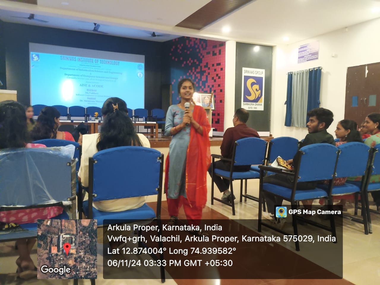 SRINIVAS INSTITUTE OF TECHNOLOGY, MANGALURU Department of Information Science and Engineering and Computer Science and Design ASSOCIATION-INAUGURATION The combined association inaugural function of AISE and ACODE was held on 6th November 2024.The event was invocated by Joshna and team of 3rd sem ISE, followed by welcome address by Sinchana Secretary of AISE. Dr.Padmanayana HOD,Department of ACODE, Prof.Sudharshan K HOD, Department of AISE, were present at the event. The association was inaugurated by the chief guest, Ms. Vaibhavi Software engineer , Aykan, Mangalore. The inaugural function was presided by Dr.Shankar K S, Head of the Department Mechanical Engineering where he appreciated the efforts in making associations and opportunities offered by college in an over-all development, coming together of diverse ideas, promote more events and programs and enhance skills. The inaugural ceremony was followed by a talk by the chief guest on ‘Effective way of learning-Placement Talk’ where she highlighted that learning isn’t limited to college, importance of settling down, preparation for placements, happenings of corporate world, being part of events. The event continued with the Dr.Padmanayana, HOD of CSD and Prof. Sudarshan K, HOD of ISE extending congratulations to the office bearers of the associations. The event was followed by complete action plan for academic year 2024-25 was presented by President of AISE Ms.Jayashree K R. Prof. Rajeshwari R Shettigar, the faculty advisor of ACODE (Association of Computer Science and Engineering), formally announced and introduced the office bearers for the respective associations fr the academic year 2024-25 to the gathered audience. Mrs. Sowmya, the faculty advisor of AISE (Association of Information Science and Engineering), announced the prize winners of various events conducted under both associations. The function was concluded with a vote of thanks delivered by Ms. Vaishnavi, Secretary of ACODE. The Chief Guest, Ms. Vaibhavi, a Software Developer at Aykan, Mangaluru, delivered an insightful talk on the topic “Pathway to Placement Success.” During her presentation, she highlighted essential strategies for students preparing for placements, including the importance of self-assessment, setting clear goals, and building both technical and interpersonal skills. She emphasized a growth mindset and adaptability as keys to thriving in today’s dynamic job market, inspiring students with practical advice and actionable steps to achieve success in their career journeys. Master of Ceremonies for the event were Aishwarya Poojari from 5th-semester ISE and Deeksha Shetty from 5th-semester CSD, who guided the proceedings with grace and enthusiasm. 1
