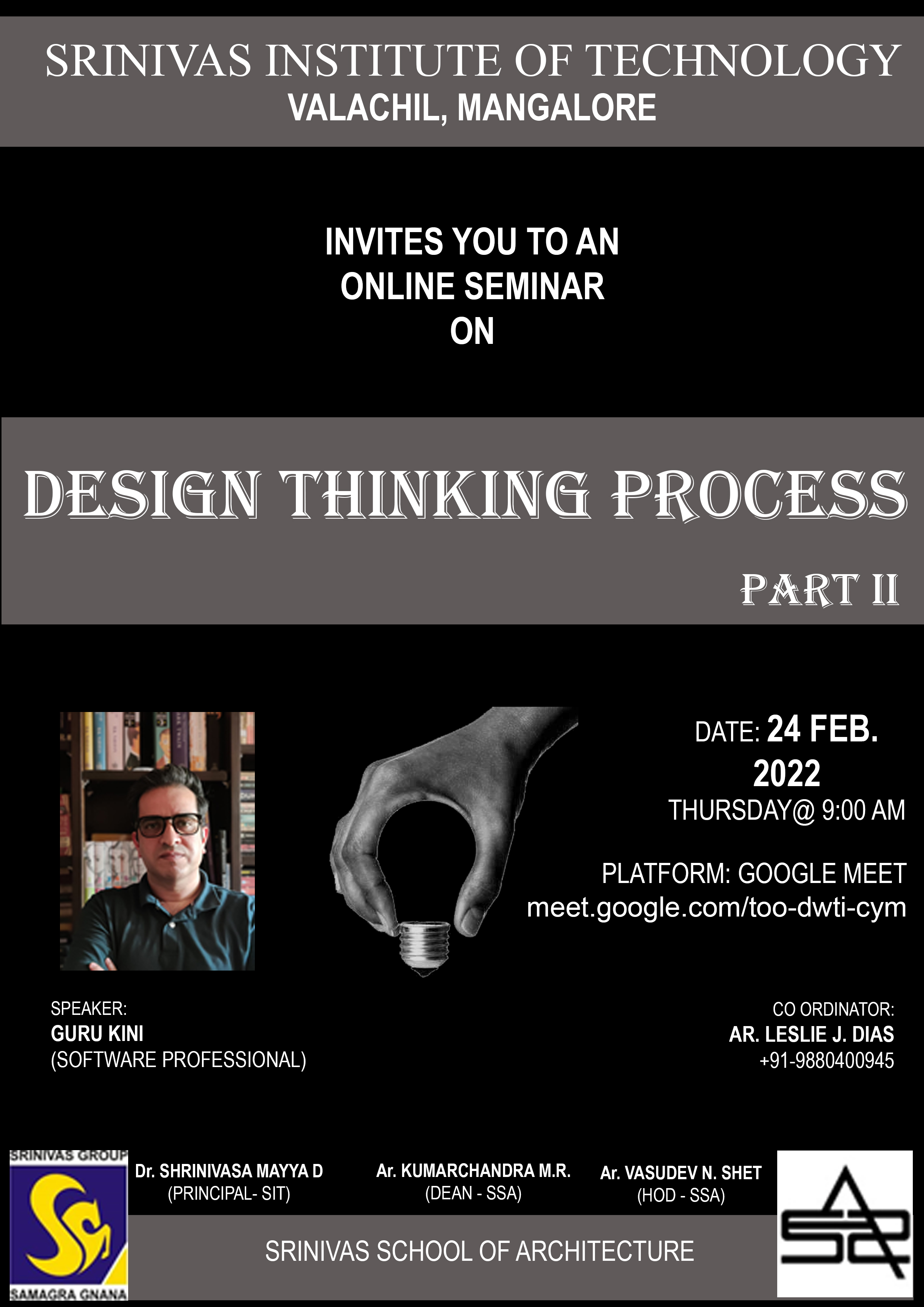 The department of architecture conducted an online webinar on design thinking and innovation for the 1’st yr. B.Arch. and 1’st yr. BE students. The speaker was Mr. Guruprasad Kini, a veteran software professional with more than 20 years of experience.The 3-part series was conducted on 5, 10 and 24 February 2022. Mr. Guruprasad explained design thinking approach and its use in real world scenarios. The workshop was coordinated by Ar. Leslie J Dias (Associate professor) of the Srinivas school of Architecture