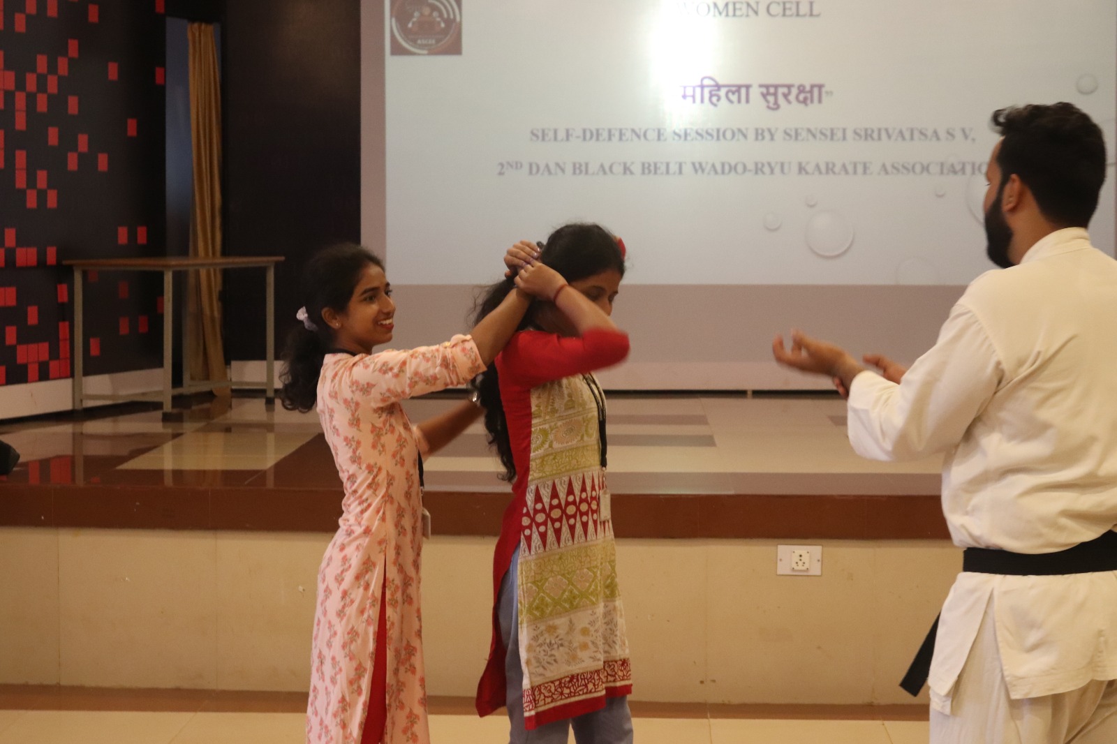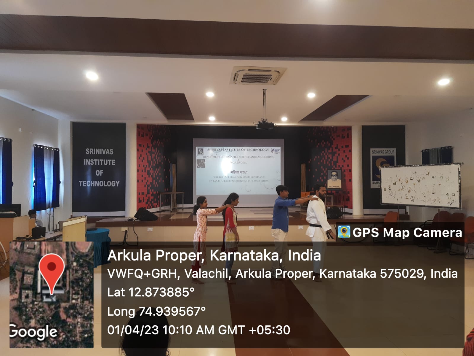 The Department of Computer Science and Engineering Student association ASCEE in association with Women Cell organised an event on self-defence for women “Mahila Suraksha” for 3rd year students on 1st April 2023 at Srinivas Institute of Technology, Mangaluru.Mr. Srivatsa S V, 2nd Dan Black Belt Wado-Ryu Karate Association trained the audience to defend themselves and their surroundings to protect them from threat of violence. He said self-defence will allow women to develop confidence and defend against any type of physical assault. He also demonstrated counter attacks techniques using punches, knees, elbows and kicks.Mrs. Deepthi P.Dsouza, Co-ordinator, Women Cell encouraged the women to be mentally strong and counter attack physical assaults. Prof.Ravishankara K, H.O.D, CS&E was present on this occasion. Ms. Shivani and Ms. Priya compered the whole event.