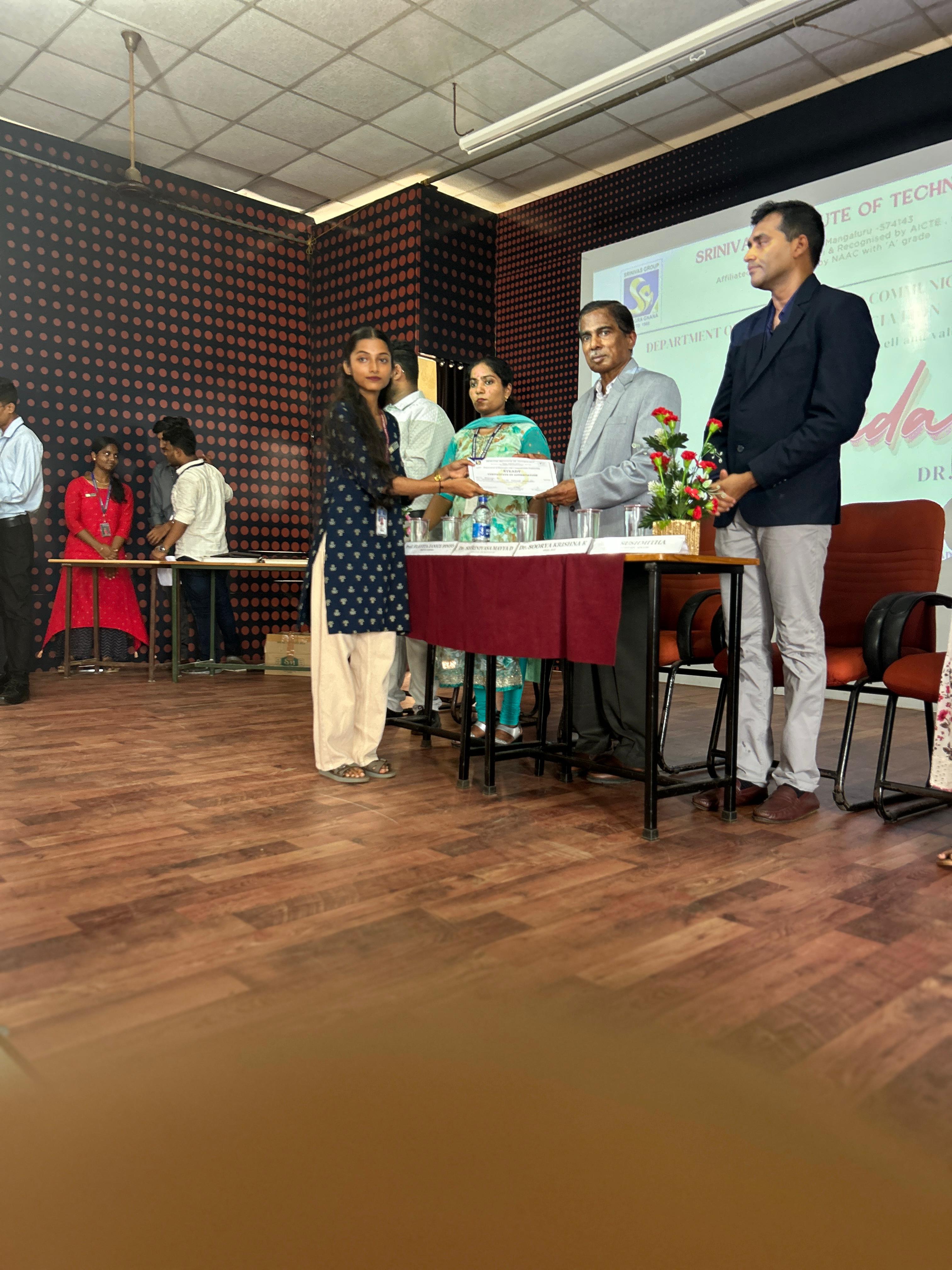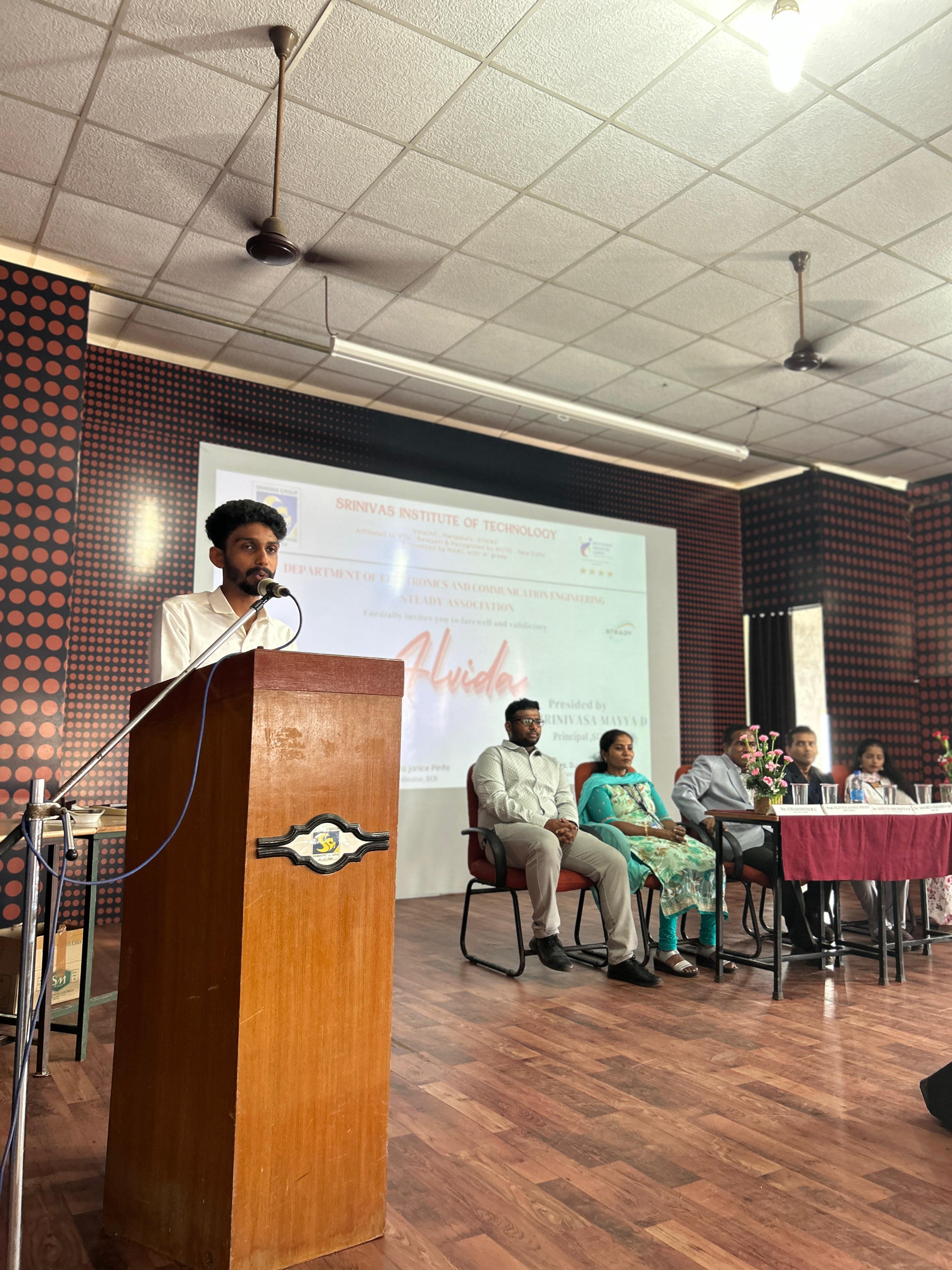 The Department of Electronics and Communication Engineering at Srinivas Institute of Technology, Valachil, held an emotional and vibrant farewell and valedictory function titled “Alvida” on Saturday, May 10, 2025, at the college auditorium under the banner of the STEADY Association. The ceremony commenced with a soulful prayer song rendered by Ms. Kavya of 6th semester ECE and Ms. Shreya of 4th semester ECE, setting a serene and respectful tone for the day. This was followed by a welcome address by Mr. Prajwal of 6th semester ECE, who warmly greeted the dignitaries, faculty, and students, highlighting the significance of the event. The event was presided over by Dr. Shrinivasa Mayya D, Principal of SIT, who in his address, appreciated the efforts of the outgoing batch and encouraged them to carry forward the values of the institution. He wished them success in all future endeavors. Dr. Soorya Krishna K, Head of the ECE Department, also addressed the gathering, expressing their pride in the students' achievements and contributions. Ms. Akshatha of 6th semester ECE presented the STEADY Association Annual Report, outlining the year’s academic and extracurricular highlights. It was followed by a prize distribution ceremony, wherein meritorious students and winners of various events and activities conducted under STEADY were recognized and honored. The event concluded with a heartfelt vote of thanks by Ms. Pranitha of 6th semester ECE, who acknowledged the efforts of the organizers, staff, and participants for making the event a memorable one. “Alvida” was a perfect blend of nostalgia, celebration, and inspiration, leaving everyone with cherished memories.