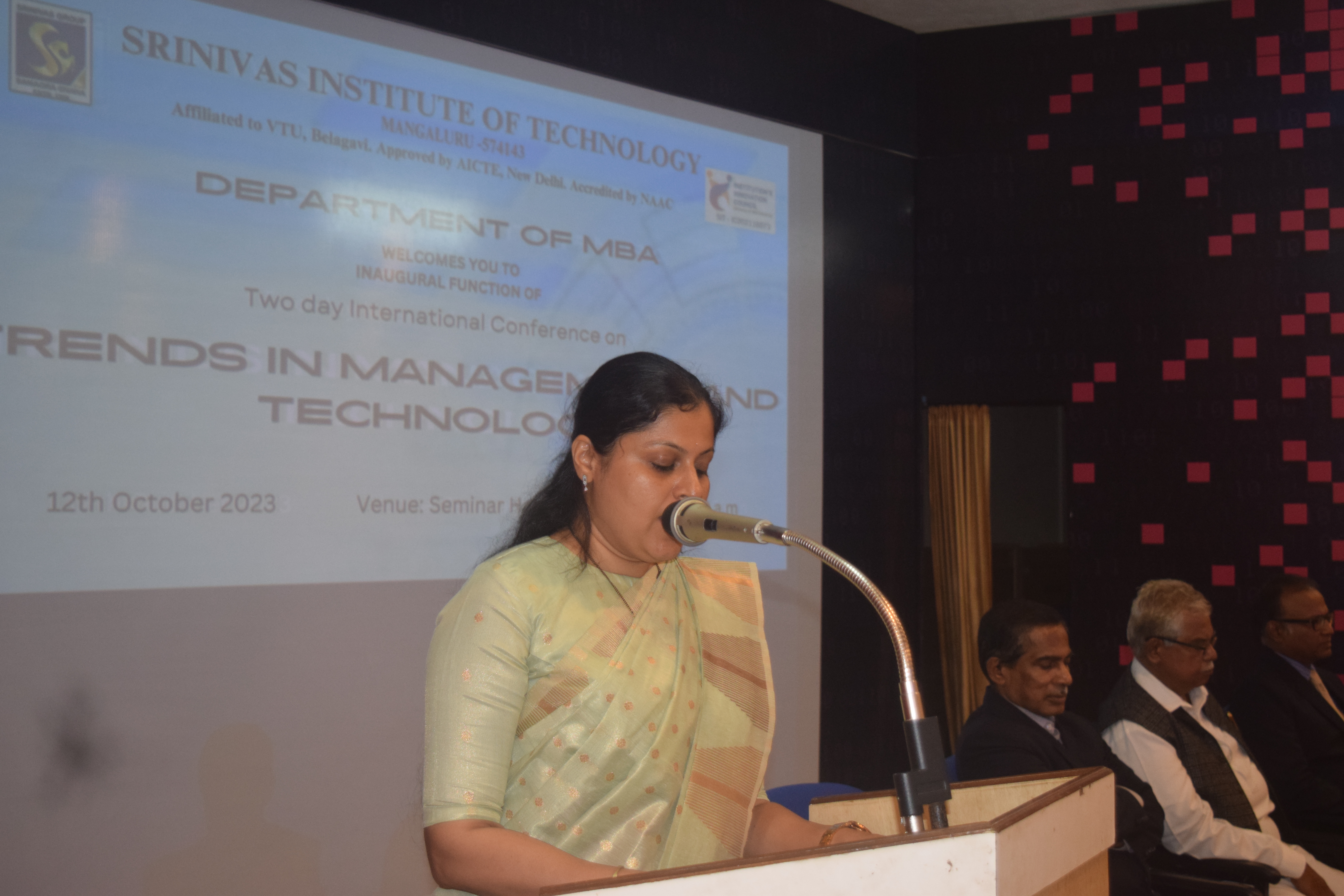 Two Day International Conference on Trends in Management and Technology was organized by MBA department of Srinivas Institute of Technology, Valachil Mangalore on 12th and 13th October 2023. The Two Day International Conference was inaugurated by Dr.P N Udaya Chandra,Former Principal, SDM College Ujire. In his inaugural address he highlighted the impact of technology on various industries and also the requirement of innovation for the development of business in the current scenario and he also delivered key note address. The formal function was inaugurated by lighting the lamp by the dignitaries. Dr.Nasser Alhamar Alkathiri, Deputy of Assistant Vice chancellor for PG studies, Scientific Research & Innovation, College of Economics & Business Administration, University of Technology & Applied Sciences, Salalah, Oman, delivered the Keynote address. Dr. Shrinivasa Mayya D, Principal of the college was the president of the function. He in his presidential address highlighted the importance of adopting latest technologies in all the sectors. Prof.Rashmi, Conference Coordinator, briefed about the conference. Dr.Ajoy S Joseph, HOD, MBA department welcomed the gathering and introduced Chief guest to the audience, Prof.Mallika delivered the vote of thanks. . Prof.Steevan Robert Tellis was the master of ceremony on the occasion. There were 3 sessions for presentations. 70 delegates from India and abroad presented their papers in this international conference.