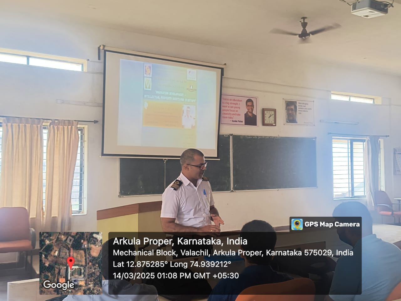 The Department of MCA, Institution’s Innovation Council (IIC) & IPR Cell organized a talk on 'Innovation Development – Intellectual Property Rights for Startups' on 14th March 2025. Mr. Vivek V Kumar, Assistant Professor, Department of Marine Engineering, Srinivas Institute of Technology, was the resource person. He provided valuable insights into patents, copyrights, trademarks, and their role in protecting startup innovations. The session covered the importance of intellectual property rights (IPR), the process of obtaining patents, and how startups can leverage IPR for business growth. The talk was highly interactive, with engaging discussions and case studies. The event concluded with a Q&A session, followed by a vote of thanks by Prof. Swapnil Pai, Event Coordinator, who expressed gratitude to the guest speaker and all dignitaries for their support. The session proved beneficial in enhancing participants’ understanding of IPR and its impact on entrepreneurship.