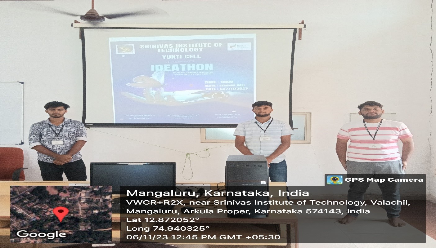 An IDEATHON – 2023 competition was organized by the Srinivas Institute of Technology,,Mangaluru in association with Institution’s Innovation Council (IIC) and Yukti cell to identify the innovative ideas of the final year students on 6 & 7 November 2023.From the department of Artificial Intelligence and Machine Learning on 06-11-2023. The selection criteria was based upon the thrust areas of Artificial Intelligence and Machine Learning, Image processing and Computer Vision. Prof. Sudarshan, Head Department of Information Science and Engineering and Prof. Atmaranjan K Associate Professor Dept. of ISE,were the judges for this event. The top project idea “Ship Detection using SAR and CCN” presented by Mr. Jibin & team was qualified for the next round to be held on 7-11-23. Prof. Daya Naik and Mr. Nivin K S coordinated the entire event.From the department Information Science & Engineering also conducted event on 06-11-2023. The selection criteria was based upon the thrust areas of Artificial Intelligence and Machine Learning, Image processing and Computer Vision. Prof. Daya Naik Associate Professor Dept of AIML and Prof. Nivin Assistant Professor Dept. of AIML were the judges on this occasion. The top project idea “Track Vision – Real Time Obstruction Tracking and Pedestrian Alert System” presented by Mr. Yajnesh & team was qualified for the next round to be held on 7-11-23. Prof. Athmaranjan K coordinate the entire event.From the department of Electronics and Communication Engineering also conducted event on 06-11-2023. The event brought together students, faculty, and technology enthusiasts’ eager to witness the latest innovations in the field of electronics and communication. The collaboration between the academic institution and Yukti Cell promised to showcase cutting-edge projects and foster a culture of innovation. Department had 6 presentations by a team of 3 members each. Presentations were evaluated by Dr. Soorya Krishna K, HOD, Department of ECE and Mr. Sathish Kumar K, Associate Professor, Department of ECE. Evaluation was done in the presence of Mrs. Sahana Girish Kundar, Assistant Professor and project coordinator of ECE and Mrs. Flavita Pinto, Assistant Professor and Yukti Cell Coordinator of ECE.Yukti Cell's presentation featured a range of projects that resonated with the audience, sparking excitement and curiosity. Two of the standout projects were qualified. The students and faculty present at the event were inspired by the possibilities these innovations held for improving communication technology and expanding access to information.On 7/11/2023 total 9 department students were participated and total 10 teams are won the prizes from the various departments won the prizes.