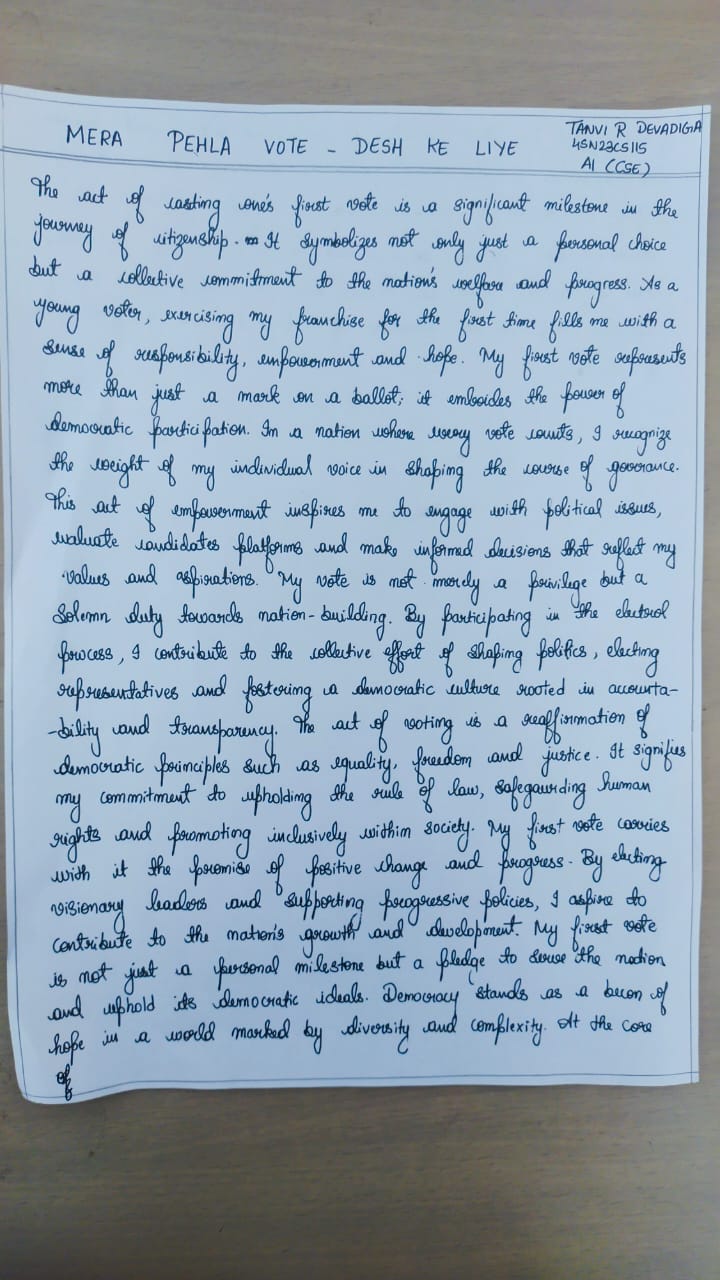 Responding to the AICTE-ECI's request, Srinivas Institute of Technology, Mangaluru, organized a campaign titled 0Mera Pehla Vote Desh Ke Liye (My First Vote for the Nation) on March 14, 2024. The campaign aimed to encourage student engagement and participation in the electoral process. As part of the campaign, essay sessions were conducted for the students, with a total of 115 participants contributing significantly to the success of the campaign. These sessions served as a pivotal platform for fostering student engagement and awareness regarding their role in shaping the future of the nation through voting.