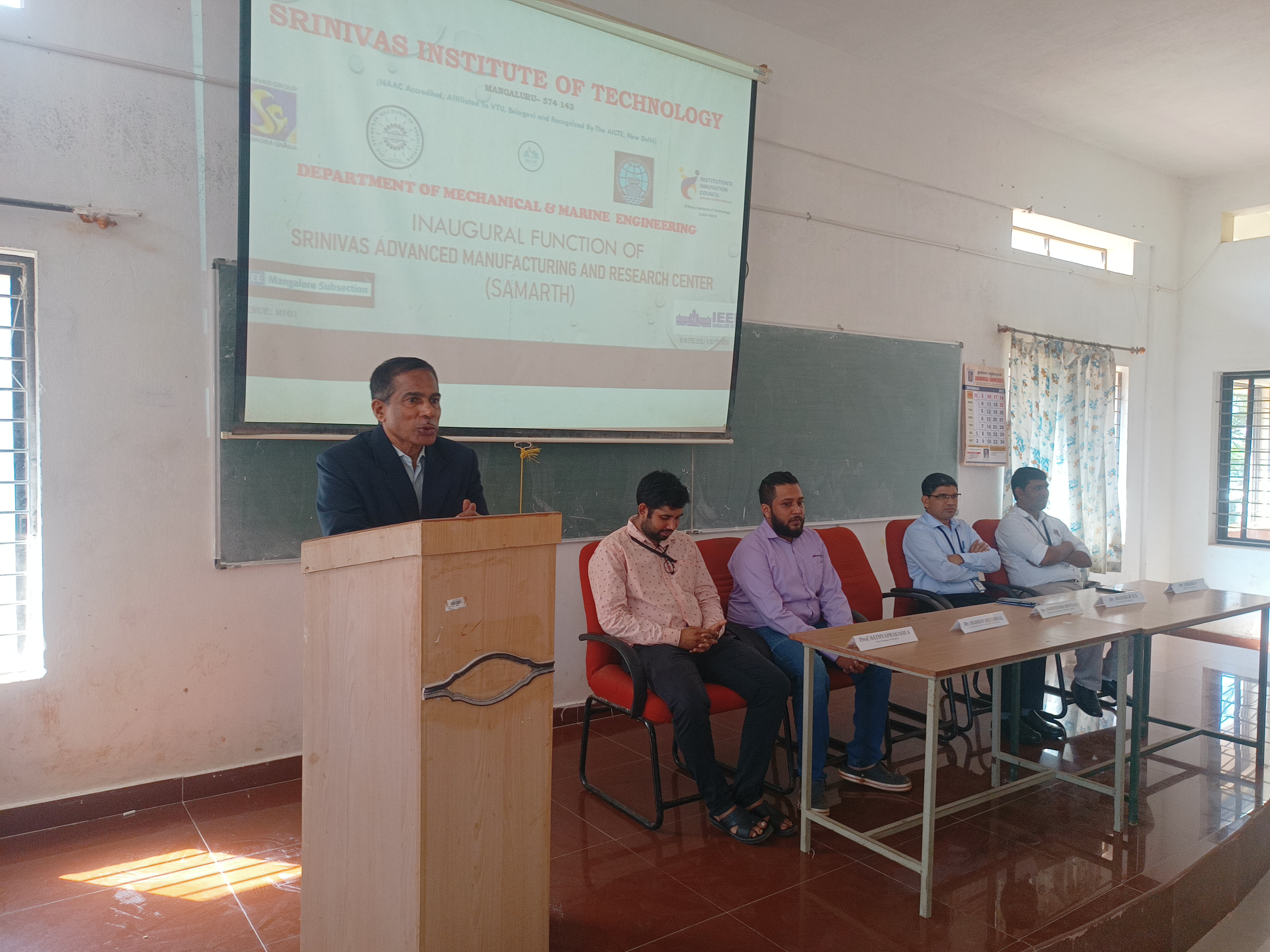 The inaugural function of Srinivas Advanced Manufacturing and Research Theatre (SAMARTH), of Mechanical engineering department, Srinivas Institute of Technology , Valachil, Mangaluru, was held on Saturday 21st December 2023. Mr. Madhav Shanbhag, Customer relation officer, JSW Paints PVT Ltd., was the Chief Guest of the function. Mr. Abhishek Bhandi of 5th sem mechanical Engineering welcomed the gathering, where as Ms Thejaswini of 3rd sem Mechanical Engineering invoked the blessings of god through her prayer. Dr. Shankar K S, Hod of Mechanical Engineering department addressed the students and thanked Mr. Madhav Shanbhag for his contribution in building SAMARTH. He also briefed about the purpose of setting the research theatre. Dr. Shrinivasa Mayya D, Principal of the college, was the president of the inaugural function, in his presidential address, he encouraged the students to make use of the new technologies available and grow themselves and to be prepared for the upcoming increase in demand for the Mechanical engineers. Dr. Lokesh V, Hod of the Marine Engineering was present during the function. Mr. SathyaPrakash, Project Manager of SAMARTH was also present during the function. Mr Subrahmanya of 5th sem Mechanical Engineering delivered the vote of thanks. The program was compered by Mr. Chirayu G.