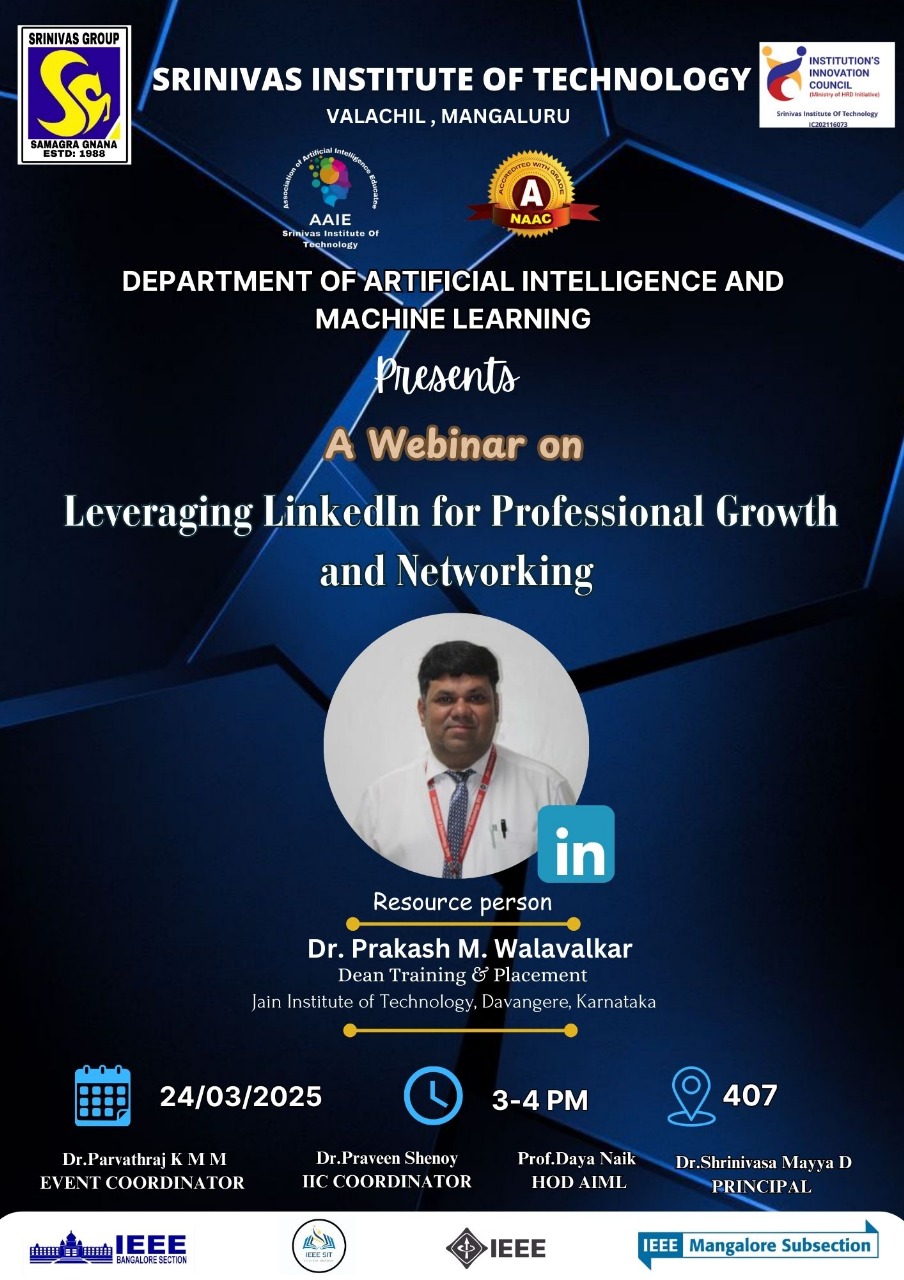 The Department of AI & ML, in association with the Institution’s Innovation Council (IIC), successfully organized a webinar on Leveraging LinkedIn for Professional Growth and Networking today. The session was led by Mr. Prakash Walawalkar, Dean – Training & Placement, Jain Institute of Technology, Davangere, Karnataka, who provided valuable insights into career building, personal branding, and effective networking strategies using LinkedIn. Students and faculty actively participated, engaging in discussions on optimizing LinkedIn profiles, building professional connections, and exploring job opportunities. The session was highly interactive and informative, equipping attendees with essential skills to enhance their professional presence. The webinar concluded with a Q&A session, leaving participants motivated and well-informed about utilizing LinkedIn for career advancement.