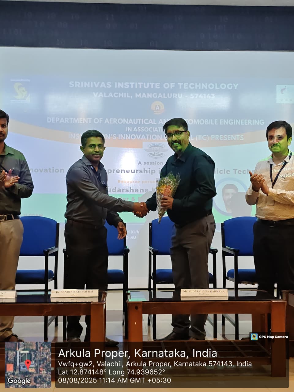 The Department of Aeronautical and Automobile Engineering of Srinivas Institute of Technology Valachil Mangaluru in association with the Institution’s Innovation Council IIC organized a session on Innovation and Entrepreneurship in Electric Vehicle Technologies on 8th August 2025 at the AC Seminar Hall The resource person for the session was Mr Sudarshana Karkala Co Founder and EV Engineer at CAR Software System Bengaluru Dr Praveen Shenoy Head of the Department of Aeronautical Engineering and IIC Coordinator and Dr Sandesh Kumar Rai Head of the Department of Automobile Engineering addressed the audience and highlighted the significance of electric vehicle technologies in the current global scenario Mr Sudarshana Karkala delivered an insightful talk focusing on recent innovations in the electric vehicle sector entrepreneurial opportunities and the integration of modern software systems in EV development He also emphasized the scope for budding engineers to contribute to the sustainable mobility ecosystem through innovation and start up ventures The program was coordinated by Mr Prakash T and Mr Vinod Kumar Staff Coordinators It was organized with the full support of Dr Shrinivasa Mayya D Principal of Srinivas Institute of Technology whose backing underscored the institution’s commitment to fostering an environment that values educational excellence and holistic student development The event concluded with Mr Karan Rai a 5th semester Automobile Engineering student delivering the vote of thanks The session ended with an interactive Q and A where participants clarified their queries and discussed potential ideas for projects and startups in EV technologies The session began at 1100 AM with Ms Kamalatha Y Shetty a 5th semester Aeronautical Engineering student extending a warm welcome to the gathering Mr Dheeraj D a 7th semester Automobile Engineering student introduced the chief guest and Ms Kavya C Mutta a 7th semester Aeronautical Engineering student served as the master of ceremonies