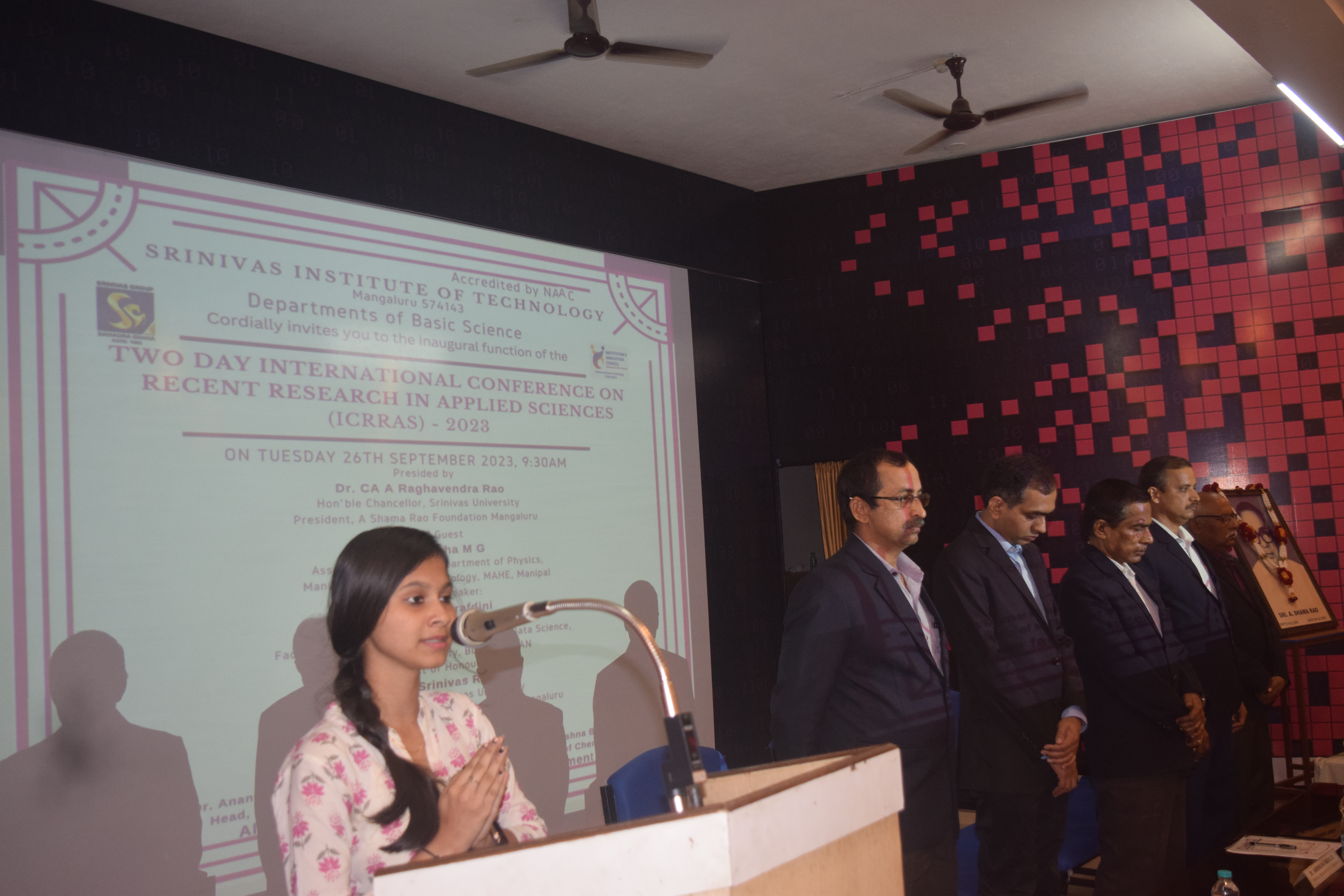 An International Conference on “Recent Research in Applied Sciences [ICRRAS-2023]” was organized by the Departments of Basic Science on 26th and 27th September 2023 at Srinivas Institute of Technology, Mangaluru. On 26th September 2023 the two day International conference being inaugurated by Dr.Mahesha M.G. Associate professor Department of Physics, Manipal Institute of Technology MAHE Manipal, commended the initiative taken by the departments of basic science while delivering inaugural speech, he mentioned that the involvement of young budding researchers by presenting their ideas with scientific community in national and international level leads to expedite the research towards the societal needs oriented to technological development and exploring his talk delivered a plenary lecture on emerging research area “Zinc doped copper oxide based photovoltaic”. Dr.Shrinivasa Mayya D, Principal of the Institute, briefed about the conference objectives. Dr CA. A. Raghavendra Rao , Honourable Chancellor of Srinivas University being presided over the function and Dr.A.Srinivas Rao, honourable Pro-Chancellor of Srinivas University being present as the guest of honour. Dr Chandrasekhara K G. Associate professor, Department of Chemistry and co-ordinator of the conference welcomed the invitees and delegates and Mrs Amitha. H Associate professor in Physics, also the co-ordinator of conference rendered vote of thanks. The inaugural programme was begun with the invocation by the student Ms. Deeksha Sharma. Dr. Sumana V.S. Assistant professor in Chemistry anchored the whole programme.