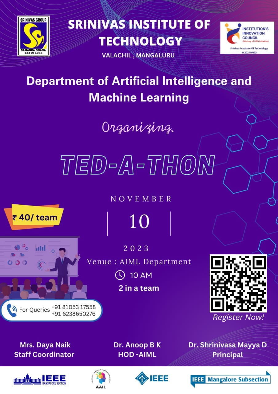 The TED-A-THON Technical Presentation Competition at Srinivas Institute of Technology on November 10, 2023 aimed to promote technical excellence, innovation, and knowledge sharing among students.