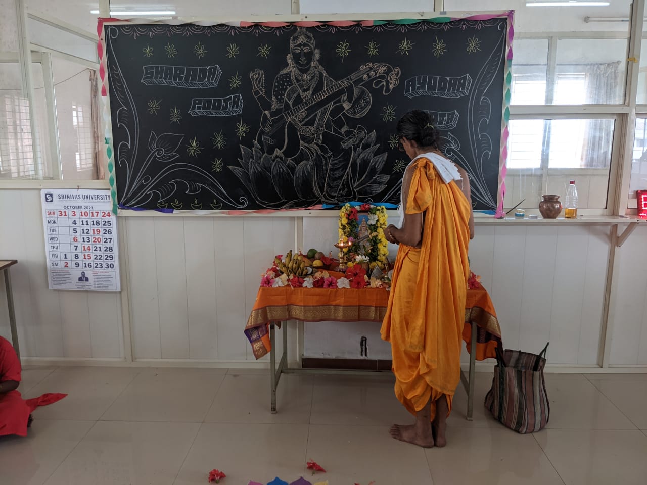 Sharadha Pooja is performed to pay reverence to Goddess Saraswati and Ayudha Pooja which is a part of the Navratri known as “Worship of Instruments”. The festival was celebrated at Srinivas Institute of Technology on 13-10-2021, at its Valachil campus. Various branches performed Pooja in their departments. Principal and all the staff and students were present during the function.