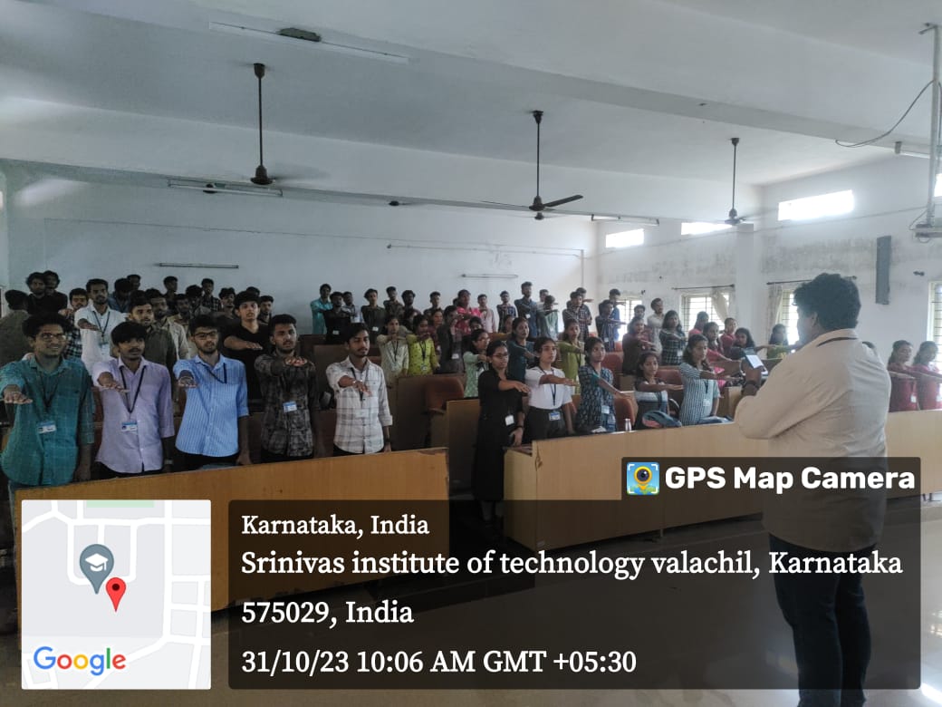 On October 31st, 2023, at 2:00 PM, the Student Associations of Marine Engineering and Mechanical Engineering at Srinivas Institute of Technology, Valachil, collaborated with the National Service Scheme (NSS) to observe Rashtriya Ekta Diwas through a pledge-taking ceremony. The event saw active participation from students and faculty members of the Mechanical and Marine Engineering Departments.